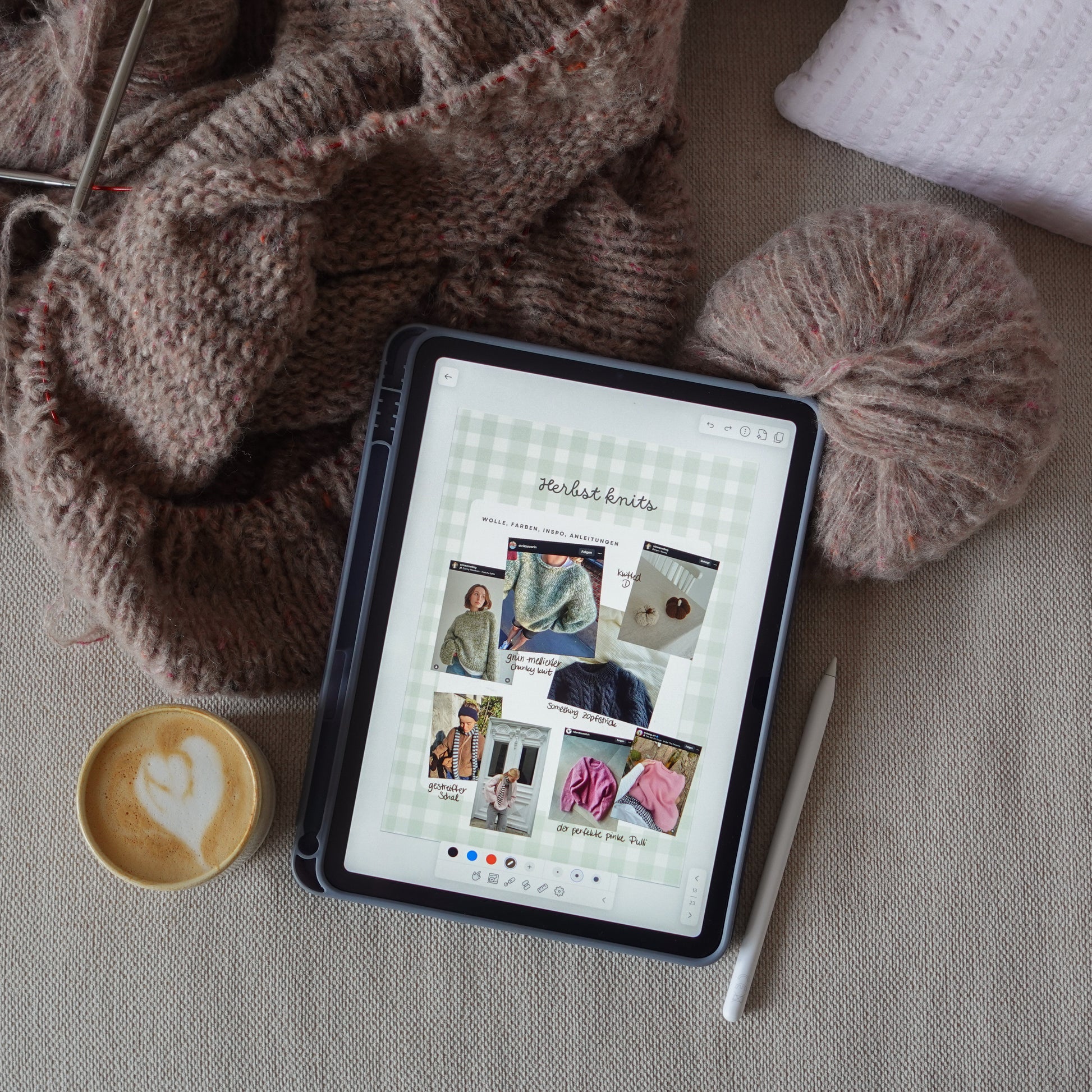 Organisiere deine Strickstücke, WIP's und kreativen Ideen in diesem digitalen Strickplaner. Hier kannst du ganz einfach Fotos und Screenshots einfügen, um deine nächsten Projekte zu planen, Woll-Inspiration abzuspeichern oder deinen Strick-Progress festzuhalten.